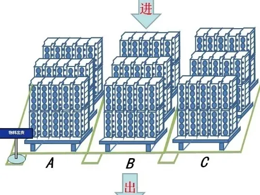 對每一批或每一個貨物,填寫看板卡,然后按照順序從后面放置,出庫時,根據(jù)最前面看板上標識的庫位出貨。